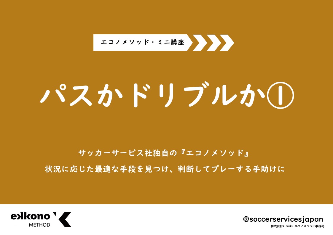サッカーサービス・エコノメソッド事務局、広報担当の板井(いたい)です!今回のコンセプトの紹介は、「パスかドリブルか」。エコノメソッドの数あるコンセプトの中でも、特に大事な要素となっています。